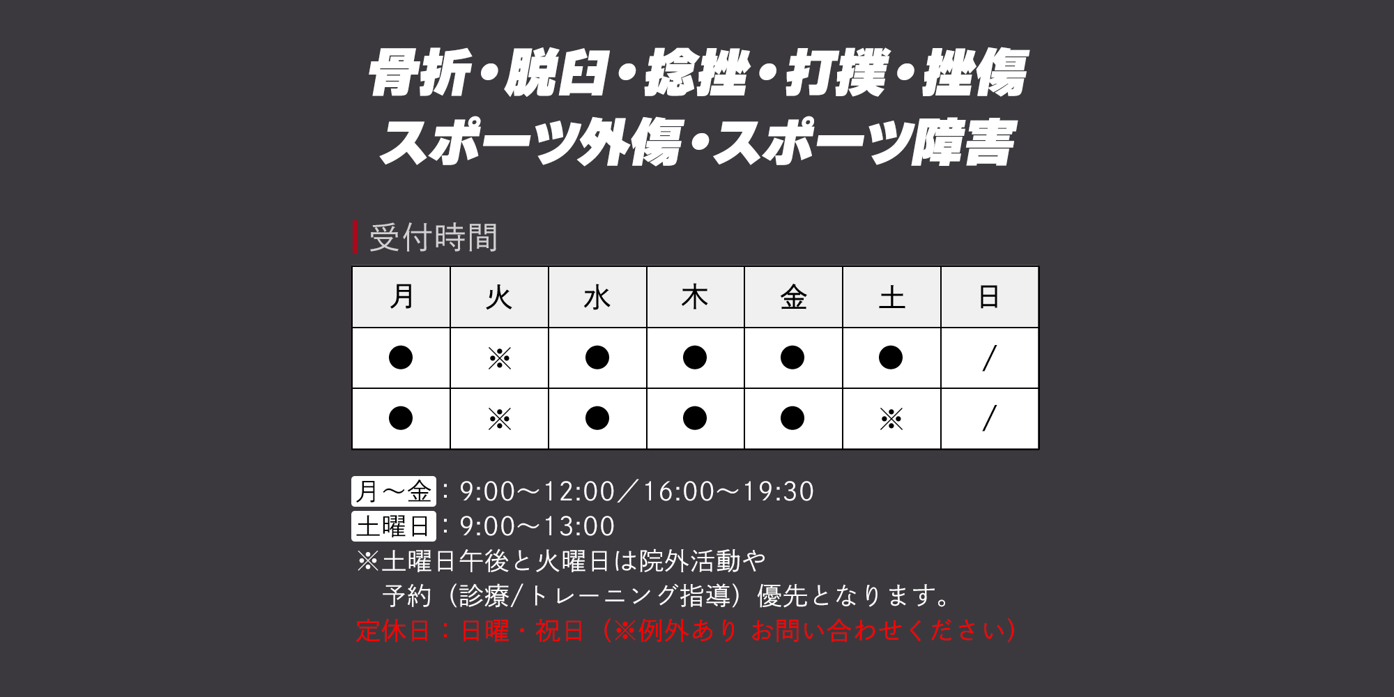 ※土曜日午後と火曜日は院外活動や予約(診療/トレーニング指導)優先となります。